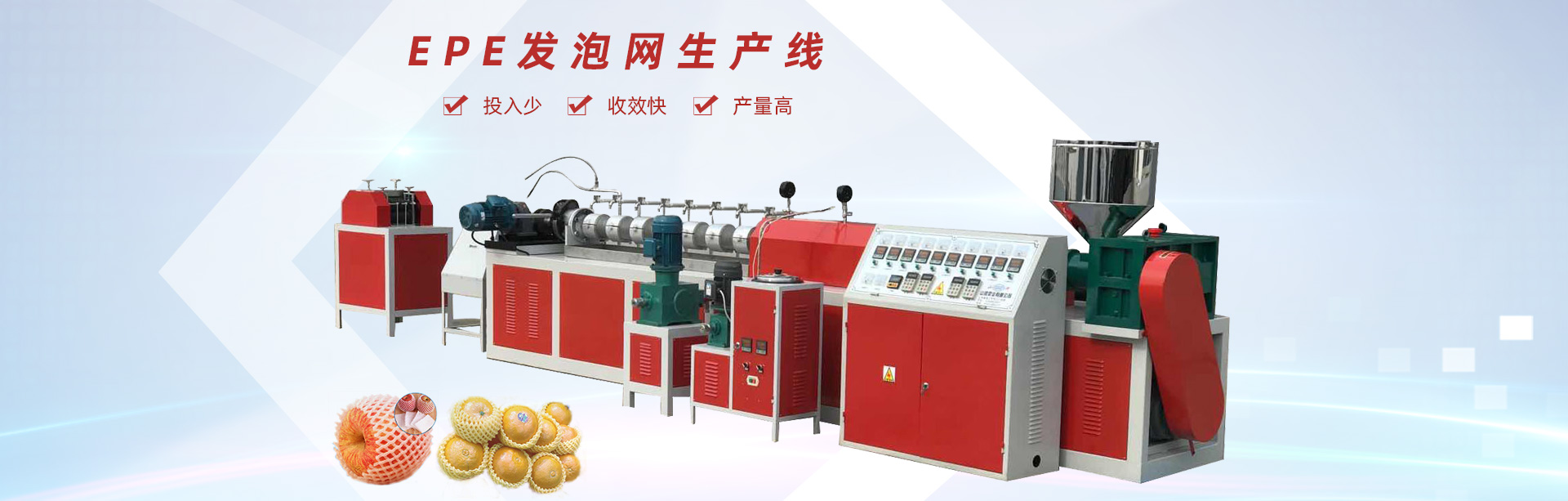 龍口市山河塑業有限公司生產的發泡網套機,用于水果、蔬菜、花蕾及瓶類的外包裝。我公司具有多年的實踐經驗和可靠的技術力量,根據市場需求開發各種規格的網套。每24小時生產蘋果網套80萬-120萬個,設備驅動電機采用變頻控制,調速精度高、范圍廣、能耗低、運行可靠每小時僅用電10度左右,產量提高。此外,該生產線配置不同的模頭和輔機可生產發泡片、發泡管、發泡棒、發泡條及異型材等產品。